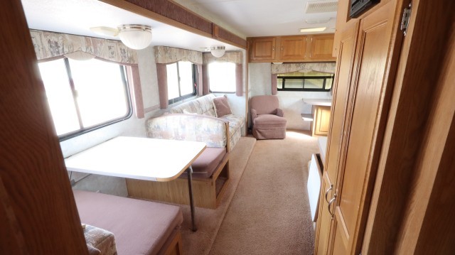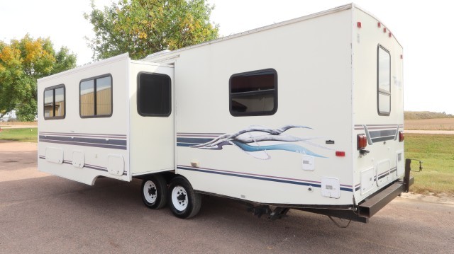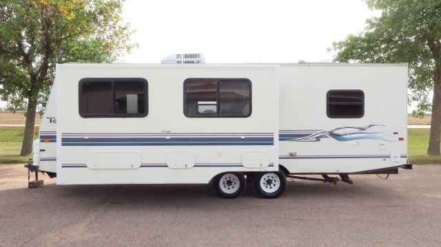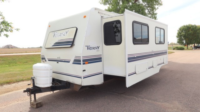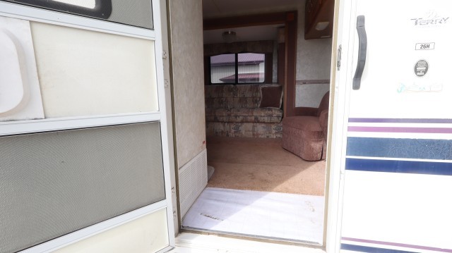 Pull Home. Spacious Fleetwood Terry M-26H 28` Travel Trailer with 1 Large Power Slide Out, Privacy Door Entry Master Bedroom With Queen Bed and Overhead Closet Space. The Kitchen Includes A Magic Chef 3 Burner Stove and Oven, Gold Star Microwave, Dometic Refrigerator with Overhead Freezer, Dual Deep Sink, Pantry, Skylight, Linear Series Surround Sound, Pull Out Sofa - That Folds Into Beds and 4 Person U-Dinette - That Folds Into A Bed. The Bathroom Includes A Walk In Shower, Vanity, Sink, Toilet, Skylight and Exhaust Fan. Lots of Storage! Very Well Maintained! Clean! Fix or Leave ``As-Is``! $20,737 MSRP.