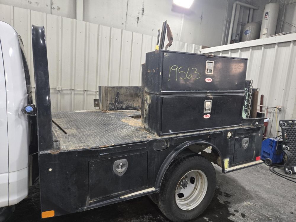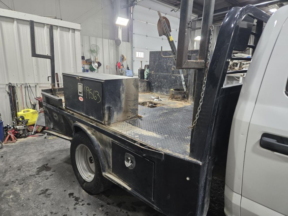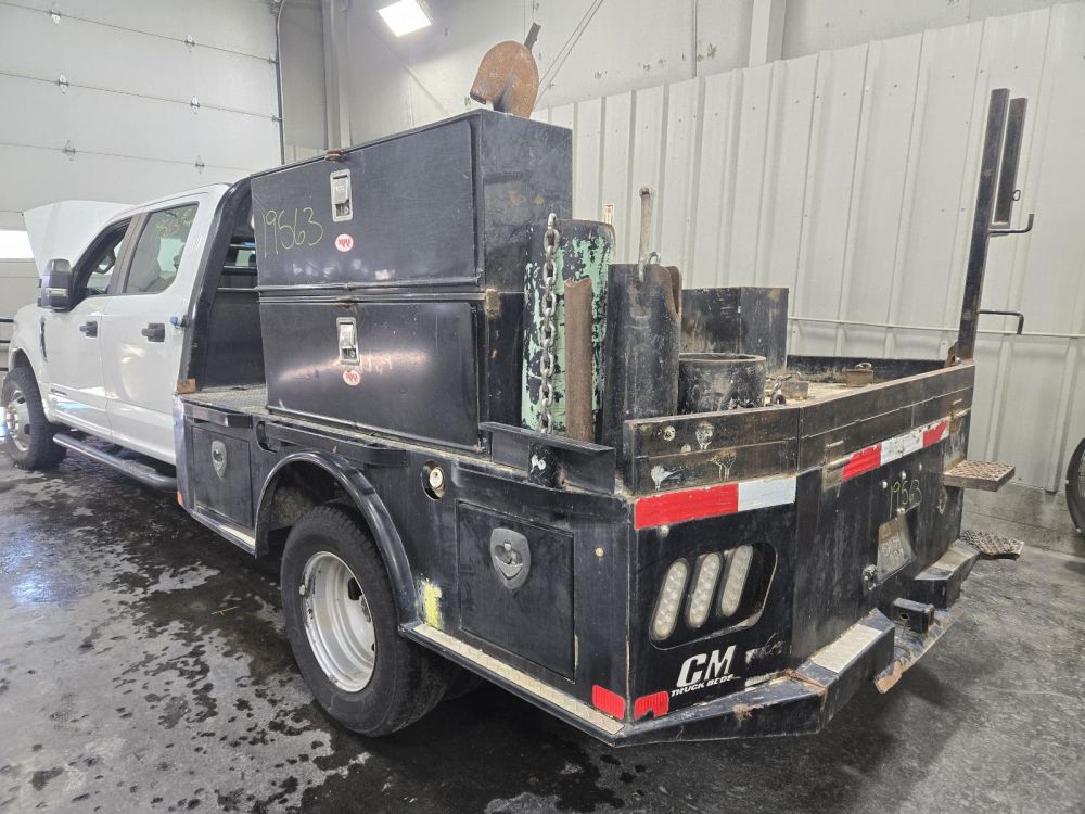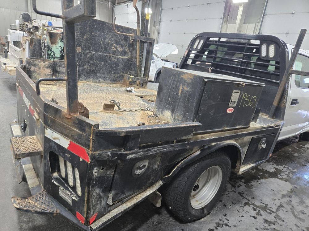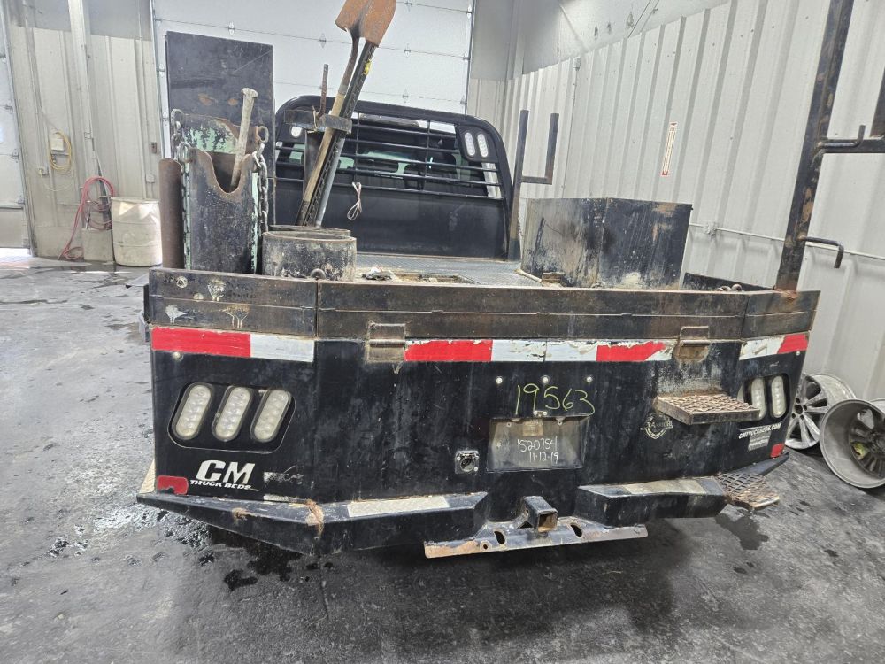 CM SKIRTED FLAT BED W/STORAGE BOXES *PASS REAR DAMAGE* 9'5" LENGTH 7'10" WIDTH 62" CAB TO AXLE 34" FRAME CAME OFF A 2019 FORD F350SD CAB & CHASSIS